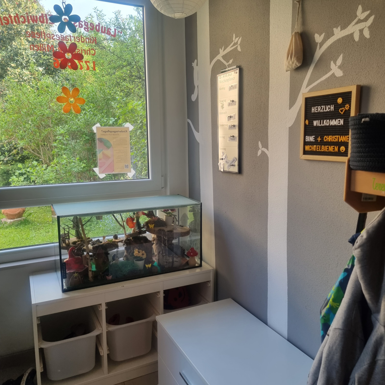 Außerdem gibt es im Eingangsbereich eine Pinnwand, auf der alle wichtigen Informationen für Eltern sichtbar sind – z. B. Elterninformationen, Schließtage, Urlaubszeiten und Weiterbildungen.