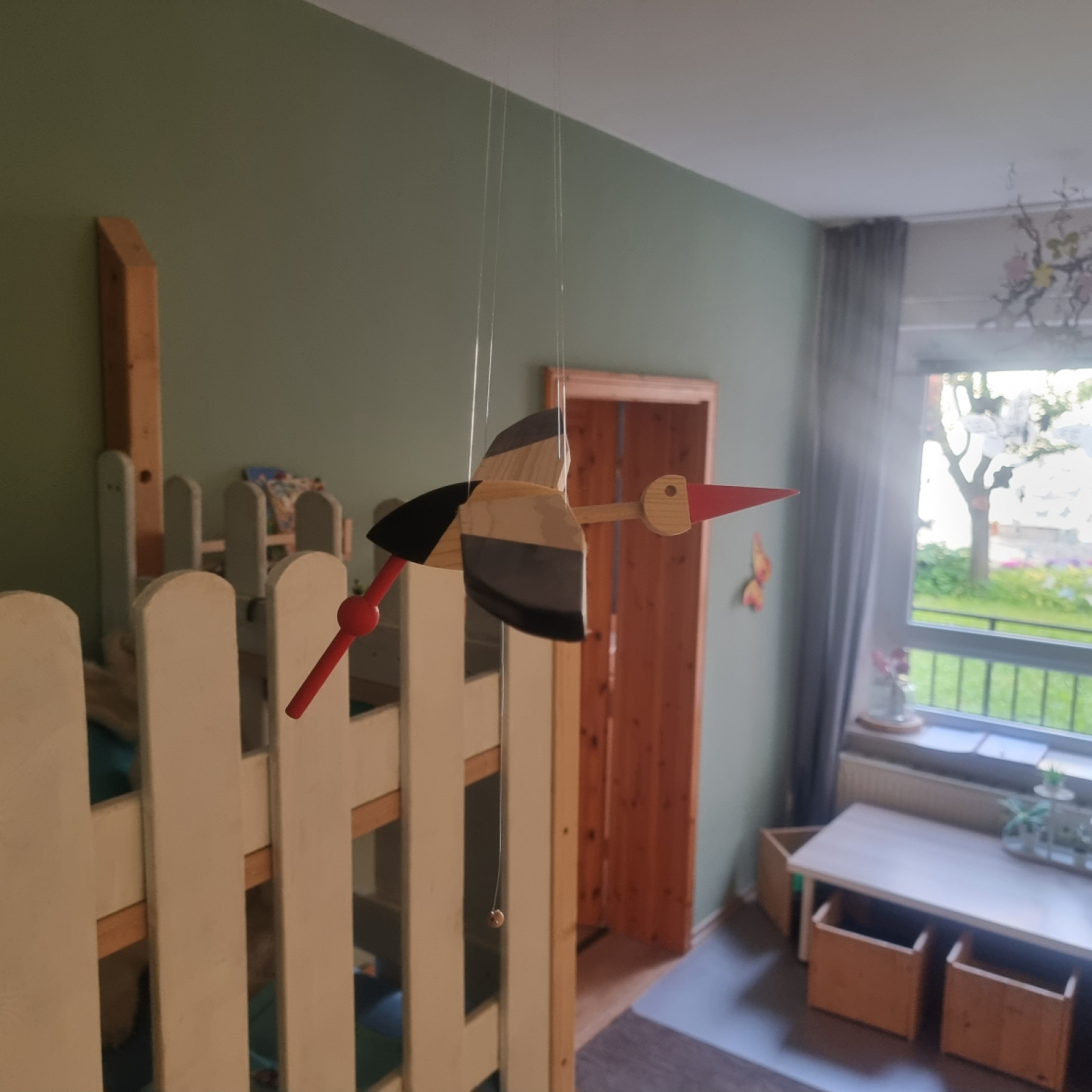 Auch während der Spielzeiten bietet der Raum Rückzugsmöglichkeiten. Die Kinder können hier die Holzeisenbahn aufbauen, eigene Möbel oder Kunstwerke gestalten, die stehen bleiben dürfen, oder ausgiebige Bauzeiten genießen. Damit schaffen wir einen Raum, der Ruhe, Kreativität und individuelle Entfaltung gleichermaßen ermöglicht.