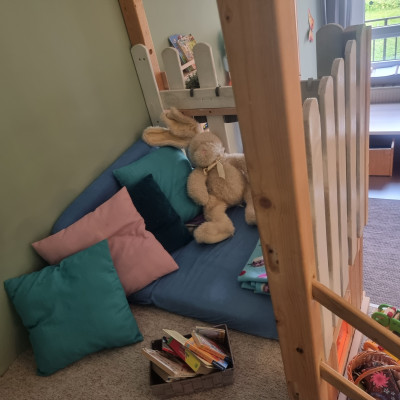 Unser Schlafbereich befindet sich in einem separaten Raum, der auch für die Töpfchenzeit genutzt wird. Jeder Schlafplatz bietet Platz für Kuscheltiere und ist mit Schlafdecken und Schlafsäcken ausgestattet. Regelmäßige Sauberkeit und Hygiene sind dabei für uns selbstverständlich.
