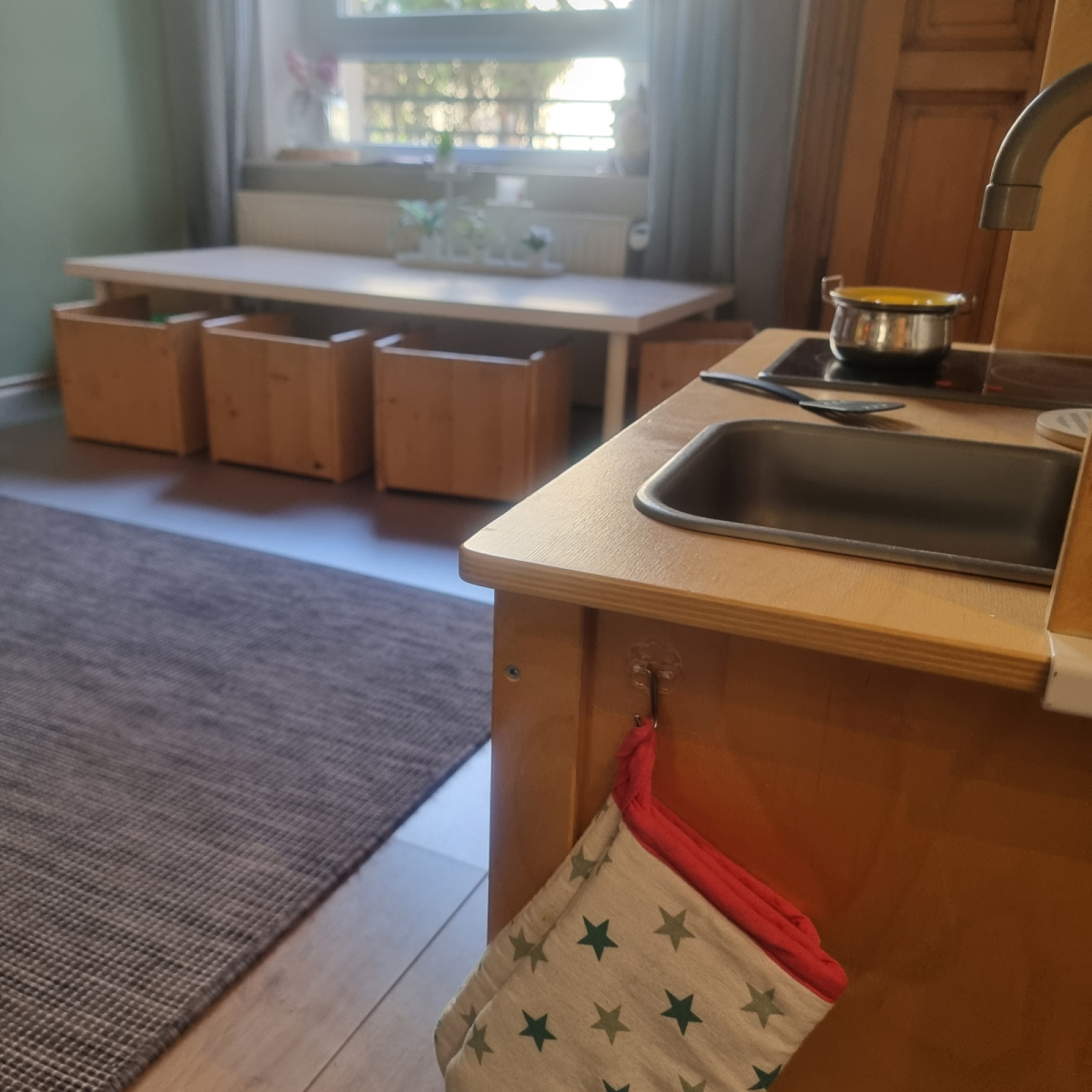 In unmittelbarer Nähe befindet sich ein Tisch mit farblich gestalteten Stühlen, an dem die Kinder jederzeit selbstständig Platz nehmen können. Die Küche ist so eingerichtet, dass die Kinder selbstständig Löffel, Teller und andere Utensilien entnehmen und ihren Platz decken können.