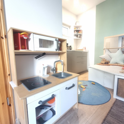 Unser Küchenbereich befindet sich in unserem ersten Raum und ist mit einer kleinen Küchenzeile ausgestattet, in der wir das Essen frisch zubereiten können. Ein Kühlschrank sorgt für die sichere Lagerung der Lebensmittel, inklusive der Kinderkost, und alle weiteren notwendigen Küchenutensilien stehen bereit.